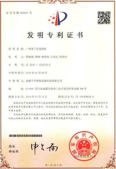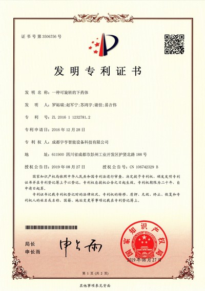 一種多自由度下藥機 發明專利證書ZL2016 1 1232770.4